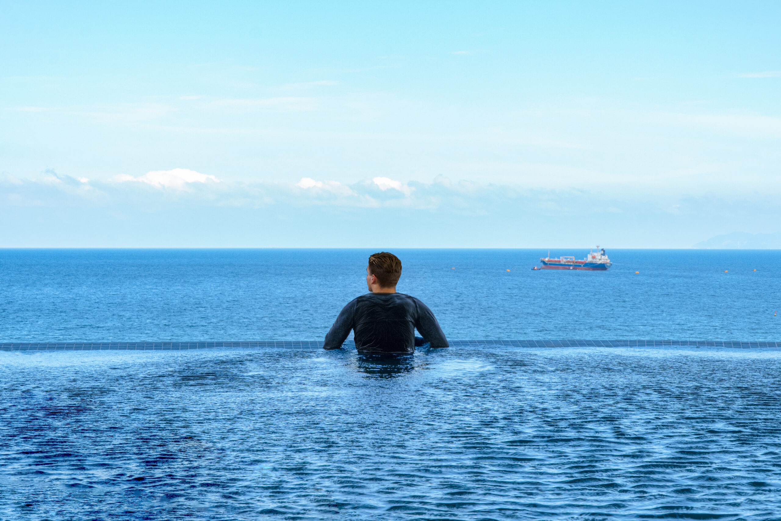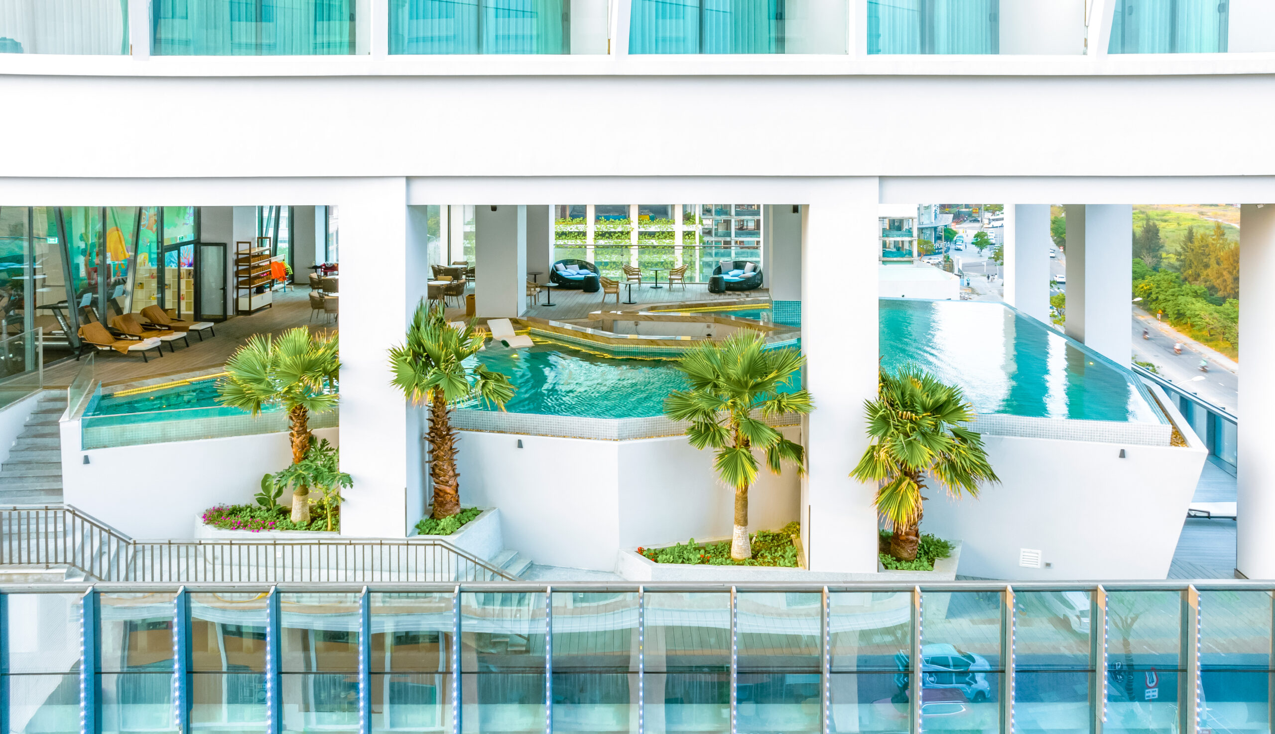 Một trong những điểm nổi bật của Awaken Danang Beach là khu vực hồ bơi mở hoàn toàn ở tầng 5, với chiều cao tầng lên đến hơn 6 mét. Khu hồ bơi này được chia thành hồ bơi người lớn và hồ bơi trẻ em, thiết kế này cho phép du khách tận hưởng không gian bơi lội thoải mái suốt cả ngày. Vị trí này không chỉ giúp tránh ánh nắng gắt vào giữa trưa mà còn giảm thiểu sự ảnh hưởng của gió mạnh vào ban chiều, mang đến một trải nghiệm thư giãn và dễ chịu hơn so với hồ bơi được đặt ở tầng thượng.
