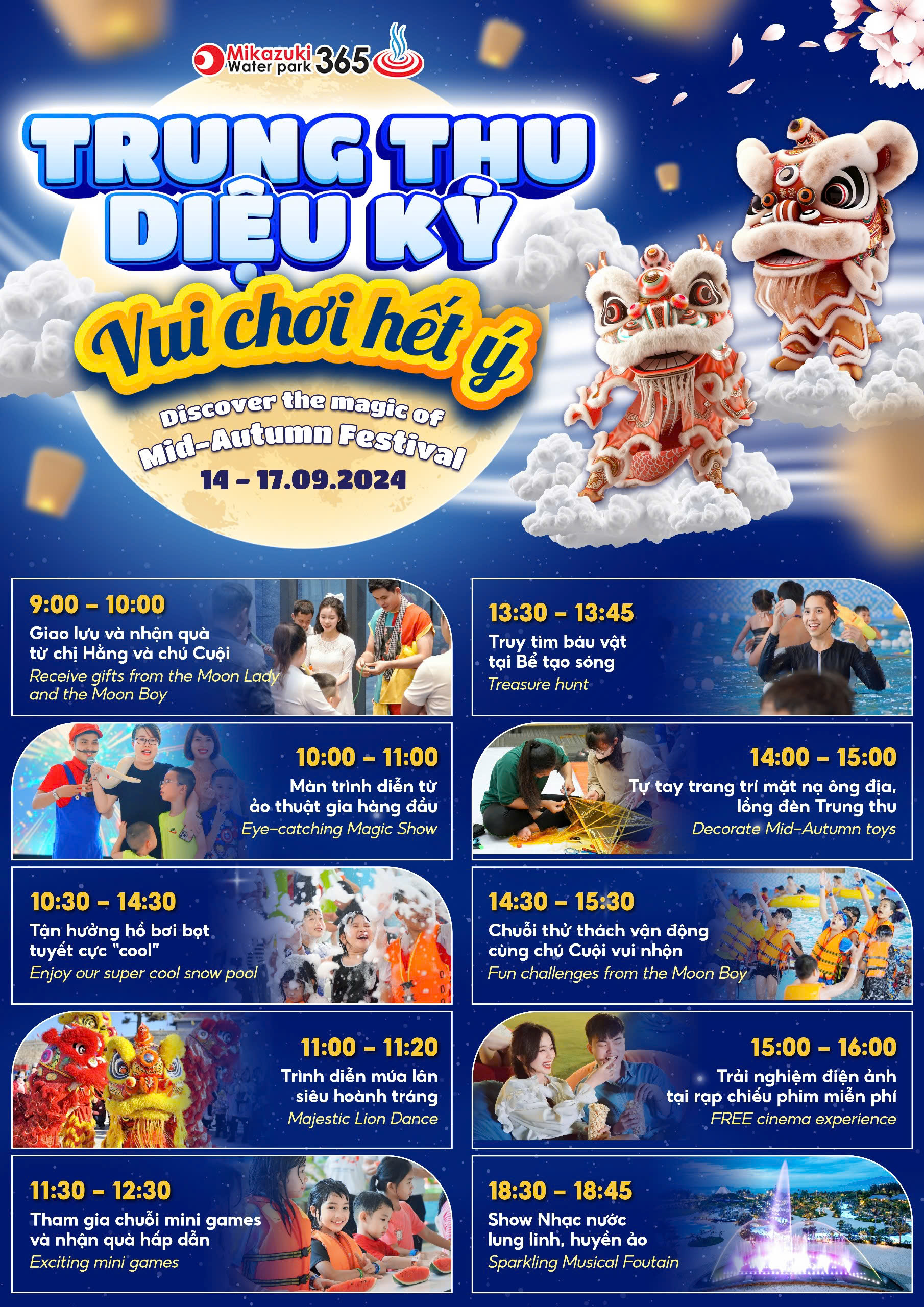 Lễ hội Trung thu Diệu Kỳ - Vui Chơi Hết Ý tại Công viên nước Mikazuki 365 sẽ diễn ra từ ngày 14/09 – 17/09/2024 với rất nhiều hoạt động hấp dẫn dành cho cả gia đình.