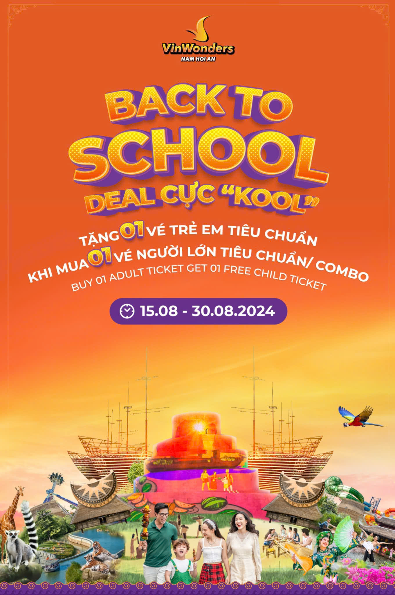 Chương trình sẽ diễn ra từ ngày 15/08/2024 đến 30/08/2024. Trong thời gian này, Quý khách hàng sẽ được hưởng nhiều ưu đãi vượt trội khi mua vé vào cổng hoặc các gói combo tham quan tại VinWonders Nam Hội An. Đây là khoảng thời gian lý tưởng để Quý khách cùng gia đình tận hưởng những ngày cuối tuần hoặc kỳ nghỉ ngắn ngày trước khi các em học sinh chính thức bước vào năm học mới.
