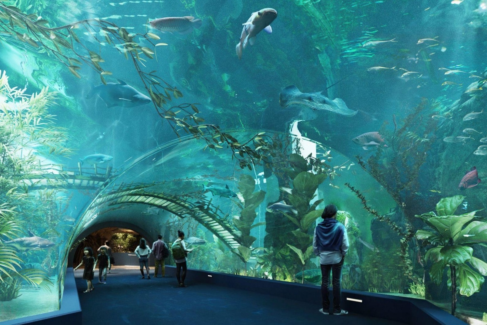 Trong không gian tối huyền bí, ánh sáng lung linh kết hợp với bể cá rộng lớn tạo nên một khung cảnh kỳ ảo. Đây không chỉ là nơi tuyệt vời để tham quan mà còn là địa điểm lý tưởng để ghi lại những khoảnh khắc kỷ niệm tuyệt đẹp.