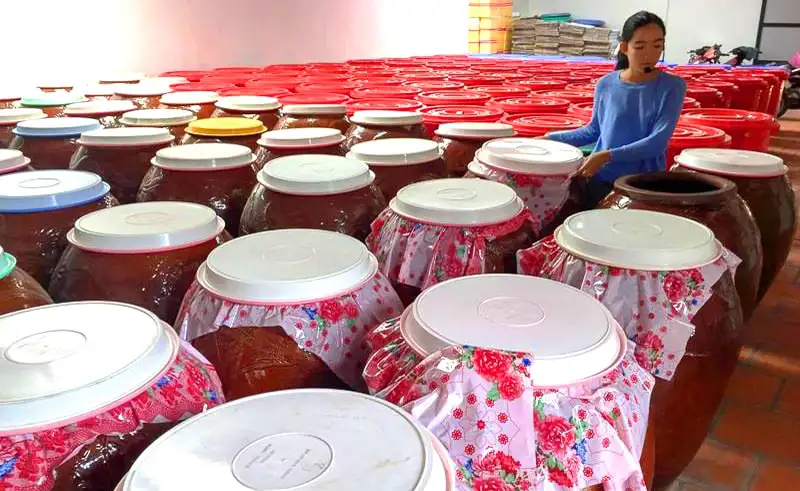 Phú Quốc không chỉ nổi tiếng với rượu sim mà còn là "vương quốc" của nước mắm – loại gia vị đã làm nên tên tuổi của đảo ngọc trên khắp thế giới. Tại đây, du khách có cơ hội tìm hiểu và chứng kiến quy trình làm nước mắm đầy công phu của người dân địa phương. Mỗi giọt nước mắm đều được chắt lọc từ những mẻ cá cơm tươi ngon, qua quy trình ủ chượp truyền thống, tạo nên hương vị đặc trưng không thể lẫn vào đâu được. Việc làm nước mắm không chỉ đơn thuần là một nghề, mà còn là một nghệ thuật, phản ánh sự khéo léo, tỉ mỉ và tâm huyết của người dân Phú Quốc.