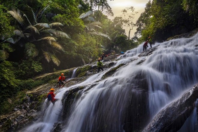 Điểm đặc biệt nhất của hành trình chính là hoạt động đu dây vượt thác từ độ cao 100m – một thử thách chưa từng có tại Quảng Bình. Bạn sẽ được treo mình lơ lửng giữa những vách đá thẳng đứng và thác nước chảy xiết, cảm nhận cảm giác chinh phục thiên nhiên hoang dã đầy phấn khích. Hoạt động này không chỉ thách thức sức bền và lòng can đảm, mà còn mang lại cho bạn cảm giác chiến thắng bản thân sau khi hoàn thành thử thách.