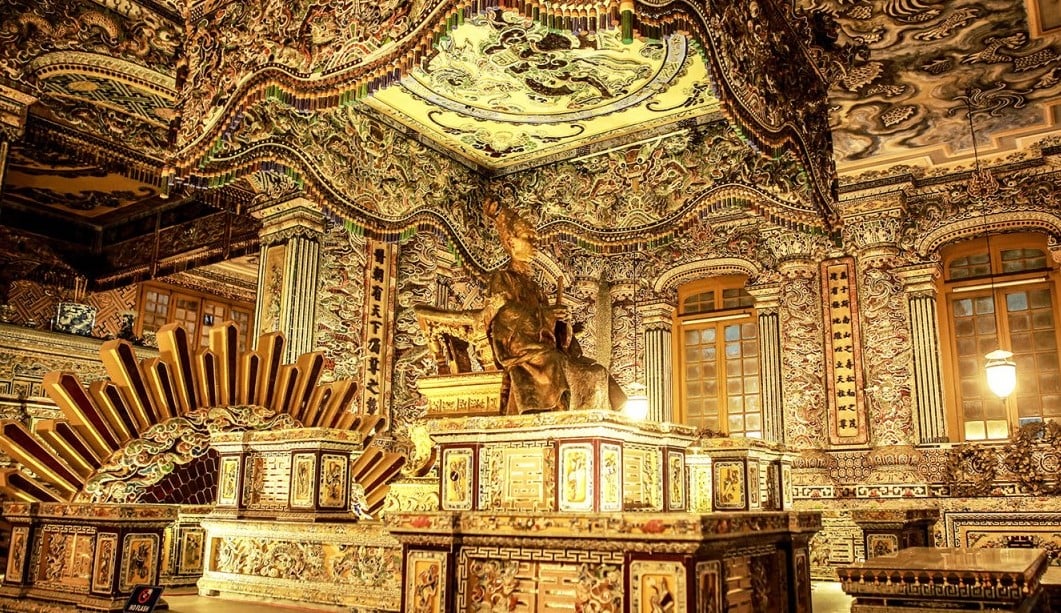 Sau khi thưởng ngoạn vẻ đẹp của Lăng Cô, bạn sẽ tiếp tục hành trình tham quan Lăng Khải Định – một trong những lăng tẩm nổi bật nhất tại Huế. Lăng Khải Định nổi tiếng với kiến trúc độc đáo, sự kết hợp tinh tế giữa nghệ thuật truyền thống Việt Nam và các yếu tố phương Tây. Từ những họa tiết trang trí tinh xảo cho đến những bức tượng đá uy nghi, tất cả đều toát lên vẻ đẹp kỳ vĩ, khiến du khách không thể rời mắt.