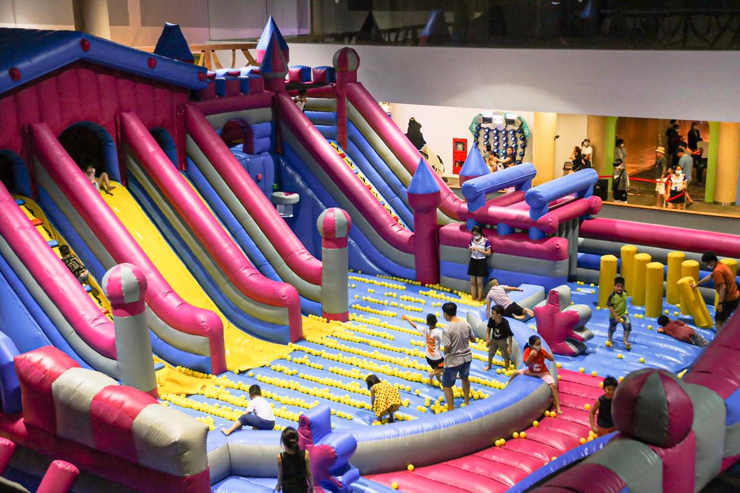 Nhà phao khổng lồ với sắc màu chủ đạo hồng, xanh dương và vàng tươi đang tạo làn sóng vui chơi giải trí mới mẻ hấp dẫn tại Đà Nẵng. Với diện tích hơn 330m2, khu nhà phao được đầu tư vật chất kĩ lưỡng và hiện đại. Các bạn có thể trải nghiệm những cảm giác nhún nhảy tự do, chơi trò ném banh vào giỏ và trượt phao vô cùng thích thú đó.